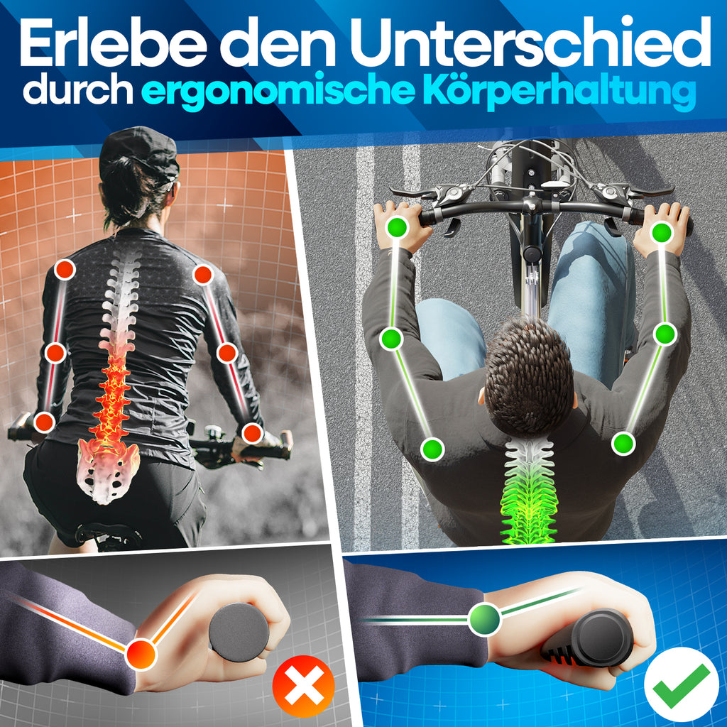 Die passgenaue Form und größeren Haltegriffe unterstützen eine natürliche Haltung deiner Handgelenke und Ellbogen. Dadurch entlastest du deine Nervenpunkte effektiv und sorgst für ein angenehmes Fahrgefühl – selbst auf langen Strecken.