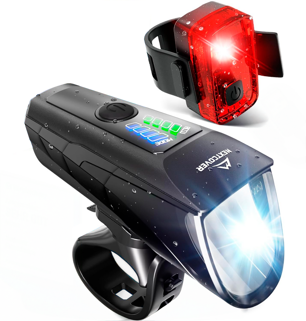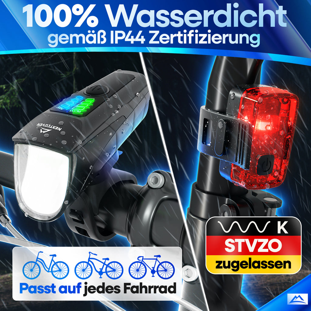 Nextcover Fahrradlicht Set mit IP44-Zertifizierung, 100 % wasserdicht und nach StVZO zugelassen – ideal für sicheres Radfahren bei Regen und Dunkelheit.