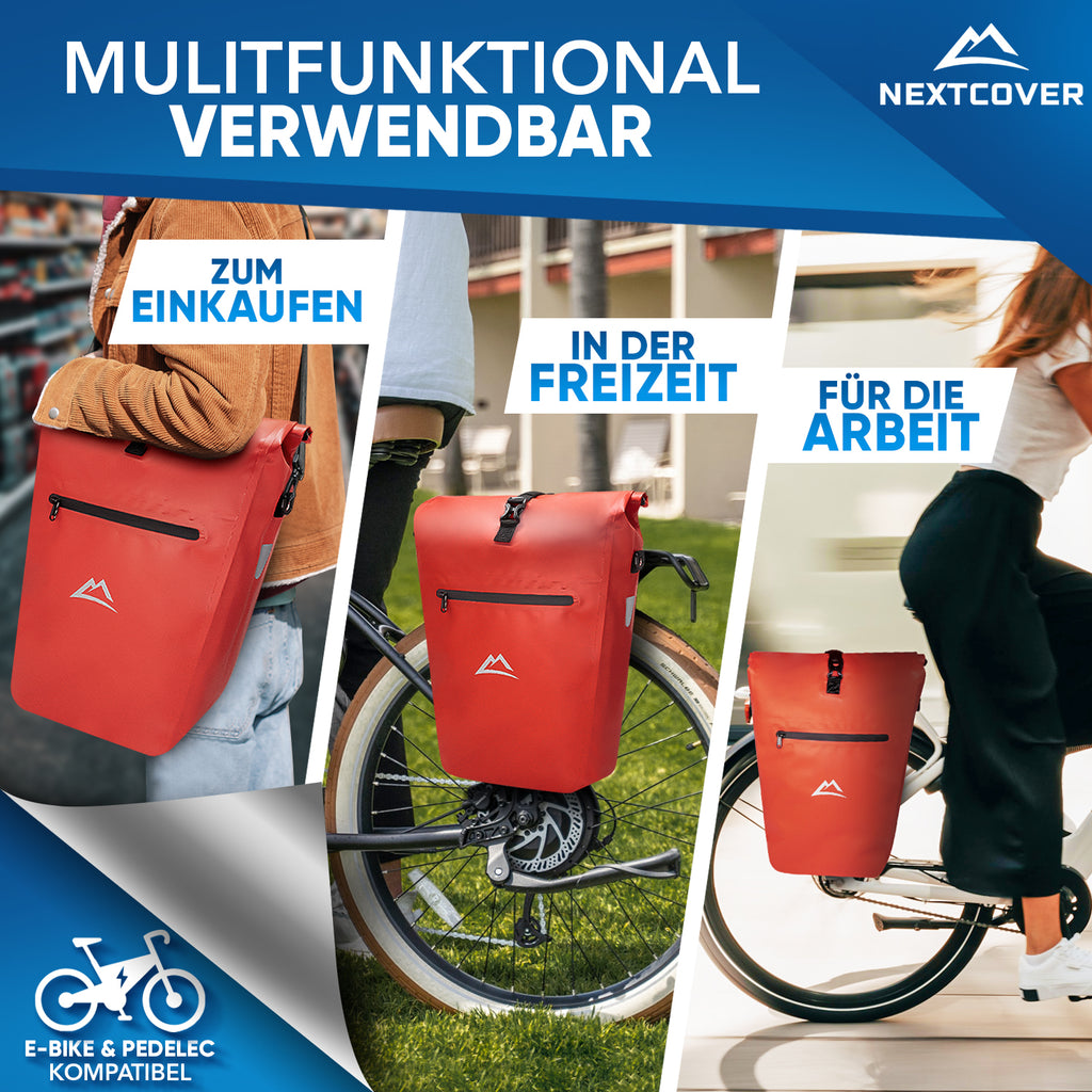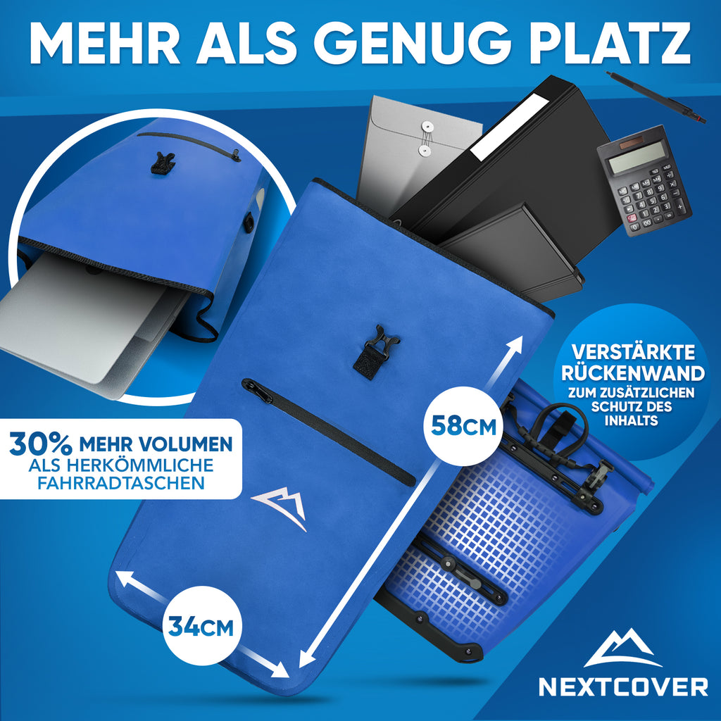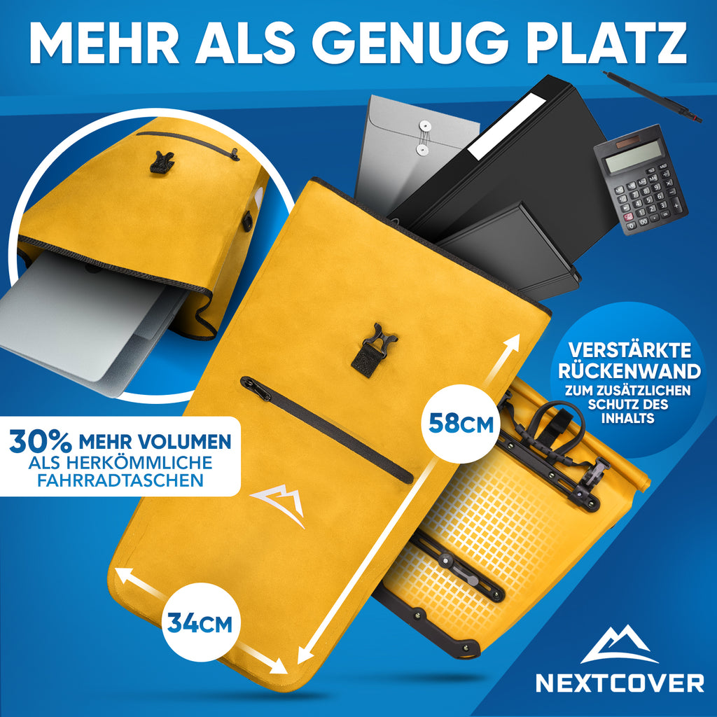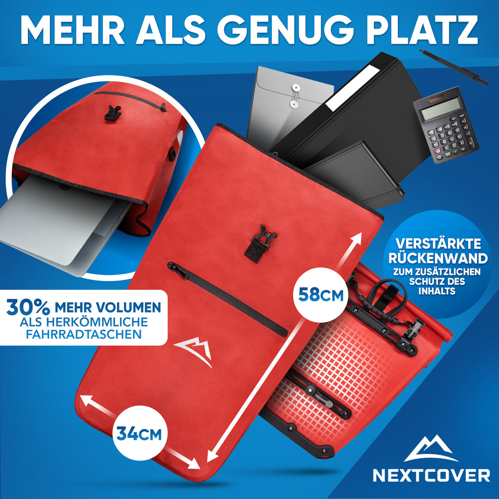 Mit 27L Volumen bietet unsere stylische Gepäckträgertasche 30% mehr Platz als herkömmliche Fahrradtaschen - Inkl. praktischem Tragegriff & abnehmbarem Schultergurt mit Polsterung.