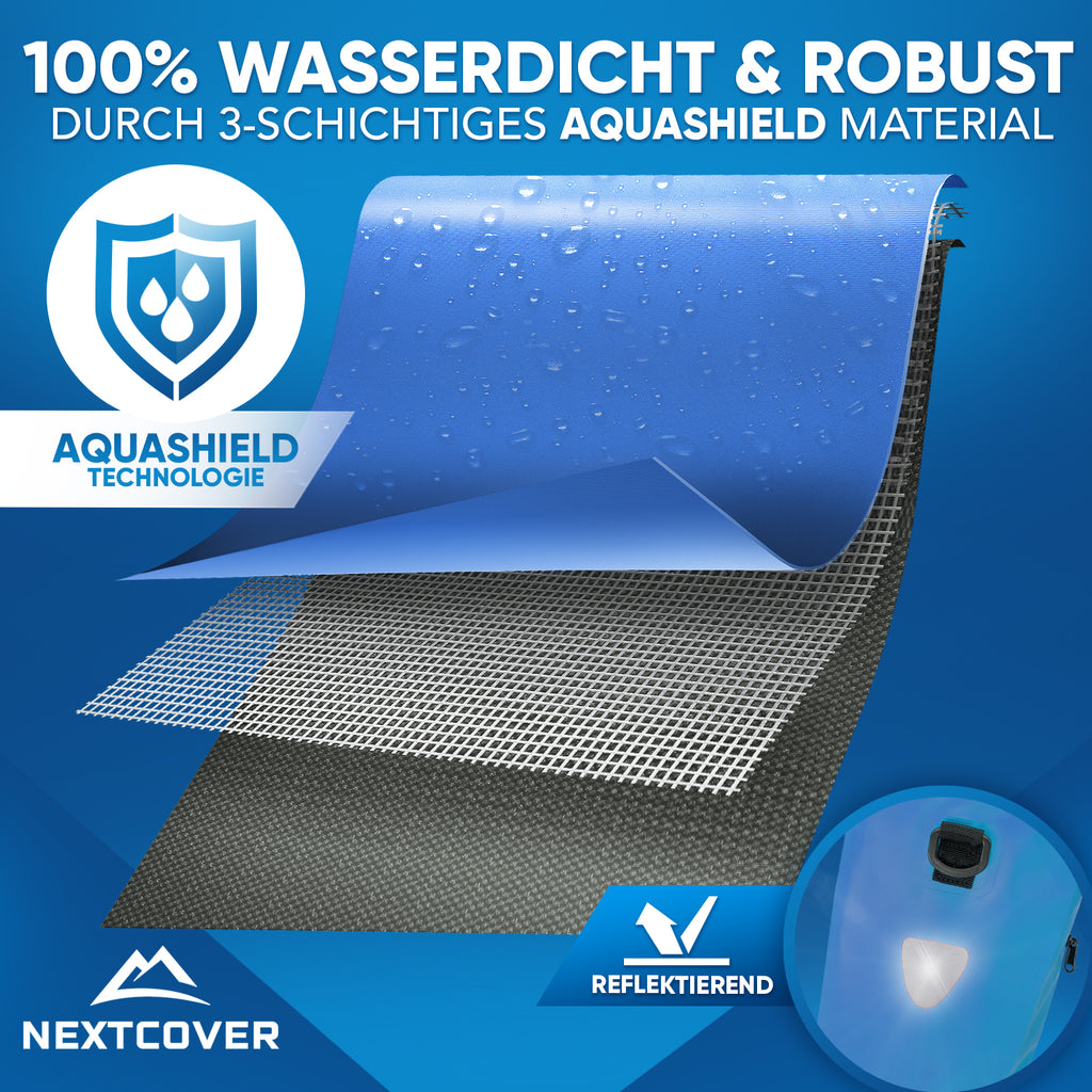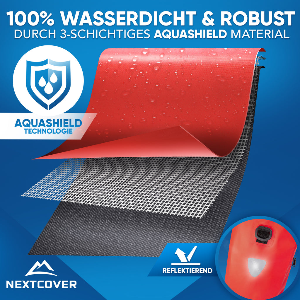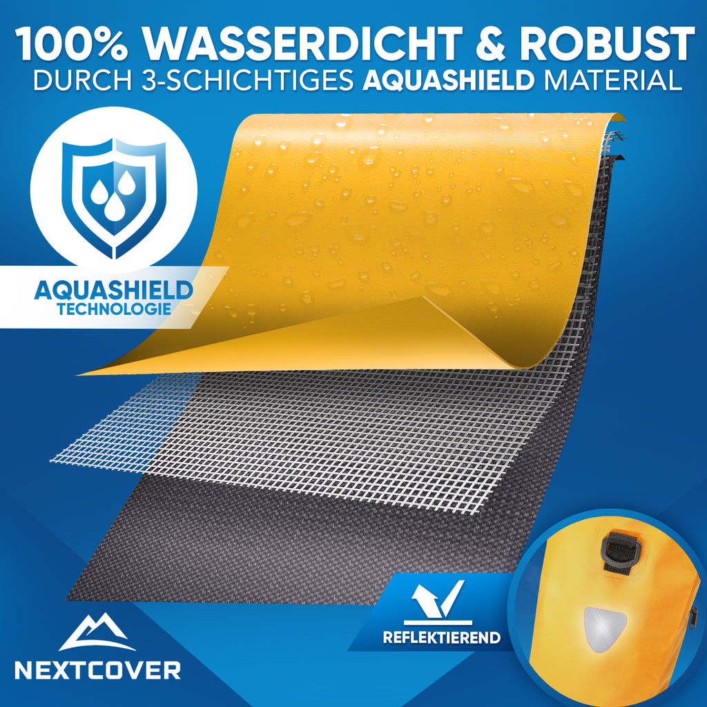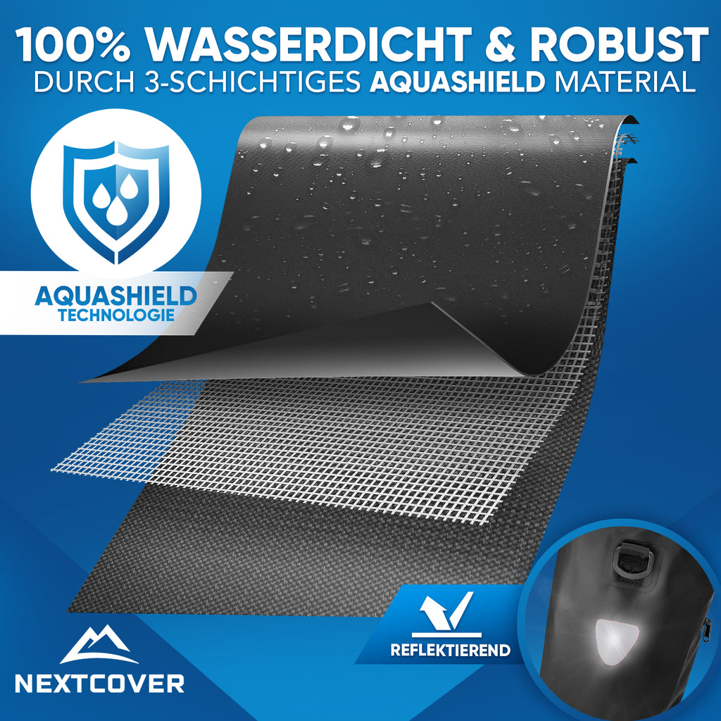 3-schichtiges AquaShield Material macht unsere praktische Fahrrad Gepäckträgertasche absolut reißfest & wasserdicht - Höchster Schutz für deine Gepäckstücke.