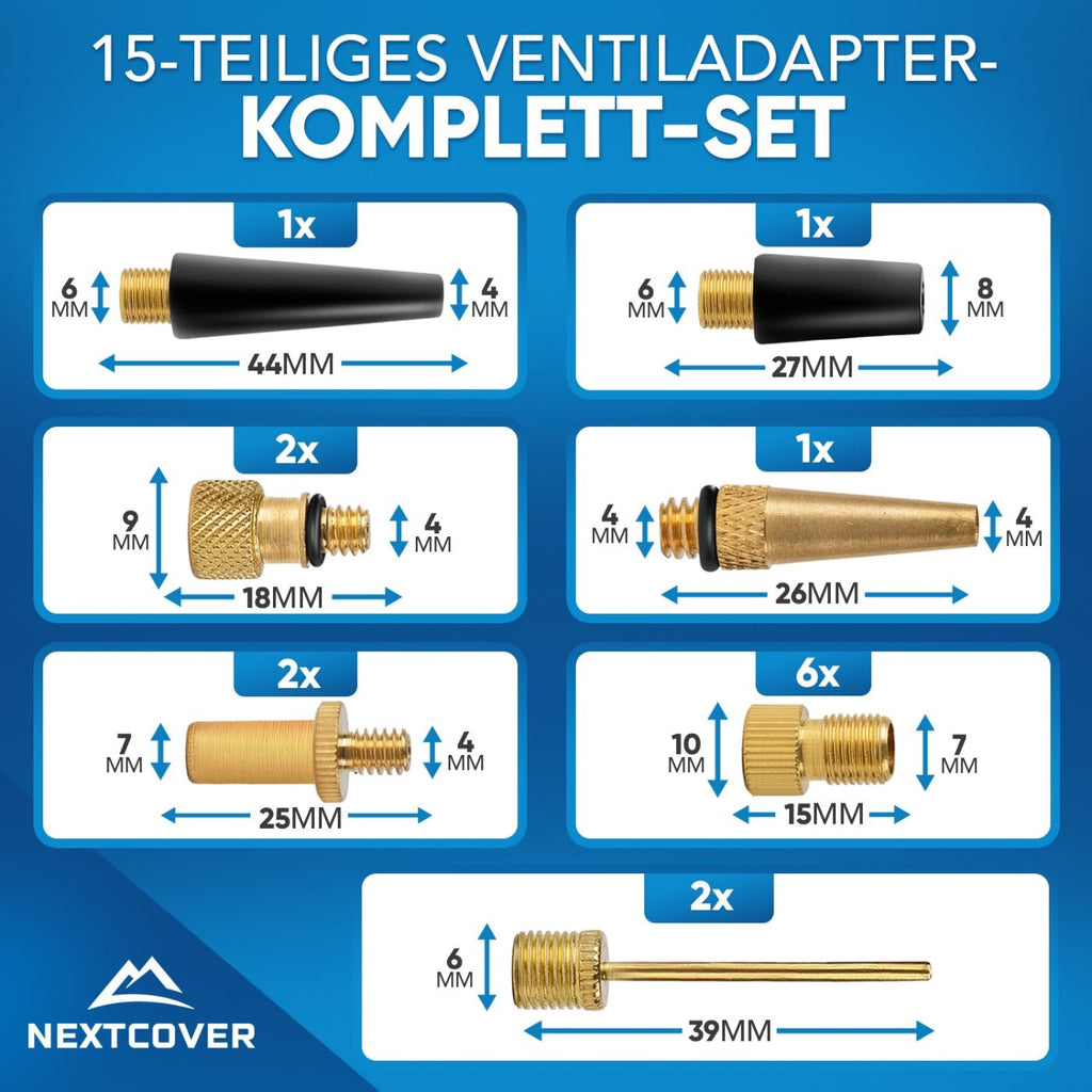 Mit 10 hochwertigen Adaptern für die gängigsten Ventilarten (DV, AV, SV) sowie 2 Ballnadeln und 3 Kegeladaptern für Luftmatratzen und Ballons bist du jederzeit optimal gerüstet.